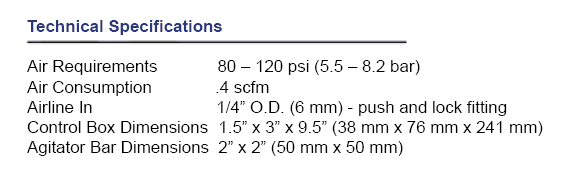 profile agitator (1.5” x 1.5”) requires no electricity,